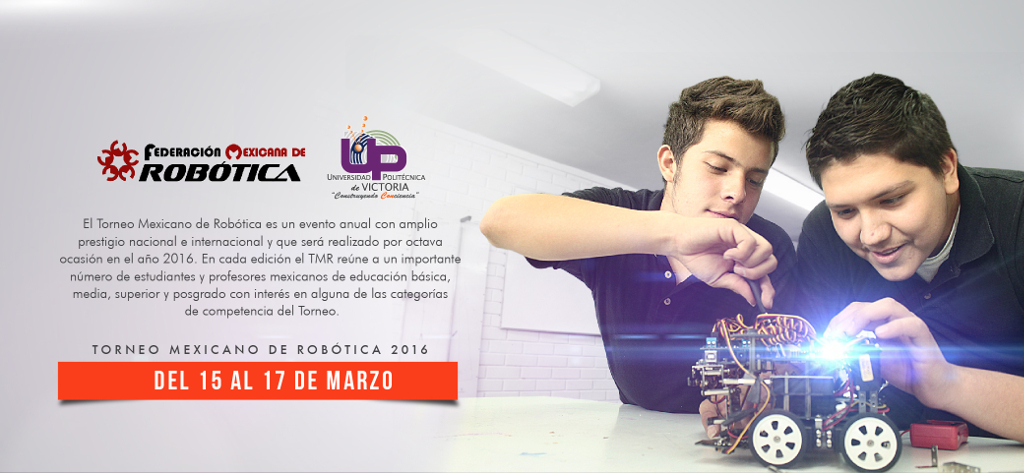 Como cada año, la Federación Mexicana de Robótica, A.C., tiene el objetivo de promover la robótica en México por lo que hacen una atenta invitación a participar el Torneo Mexicano de Robótica 2016 (TMR2016). Dicho evento se celebrará en el Polyforum “Dr. Rodolfo Torre Cantú” (antes Polyforum Victoria) en Cd. Victoria Tamaulipas del 15 al 17 de marzo del 2016.
